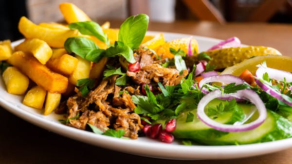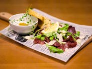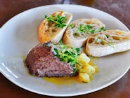 wołowina/suszony pomidor/cebula/chatney na ostro z mango/sos majonezowy/placek ziemniaczany/sałata -