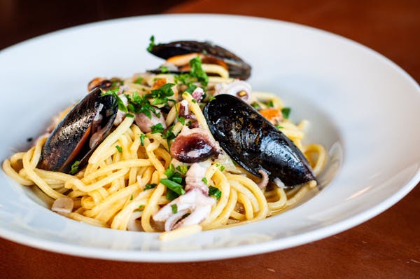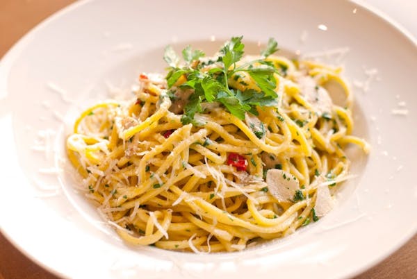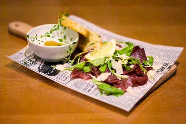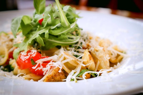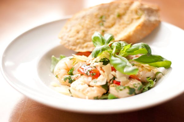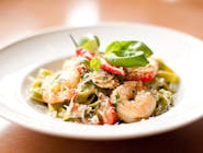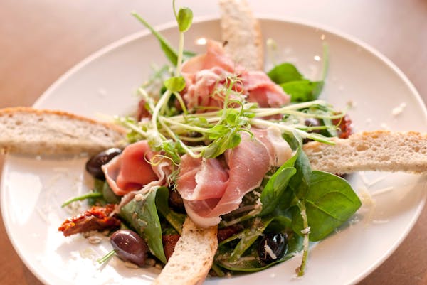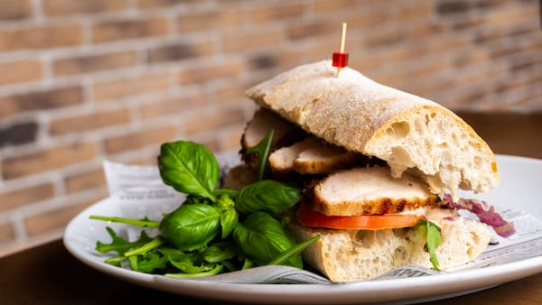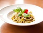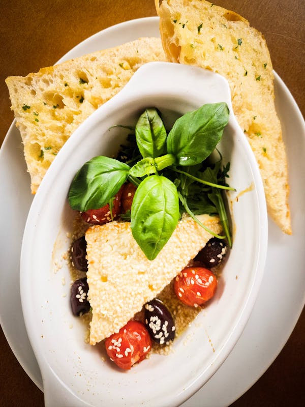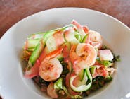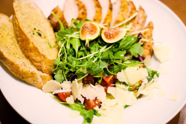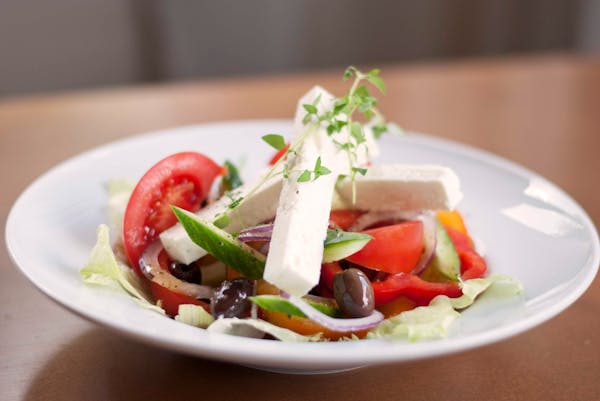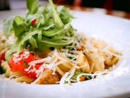 Tuńczyk, roszponka, jajo, oliwki kalamata, cebula czerwona, pomidor cherry, kapary, sos cezar, grzanka czosnkowa