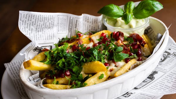 wołowina/suszony pomidor/cebula/chatney na ostro z mango/sos majonezowy/placek ziemniaczany/sałata/frytki